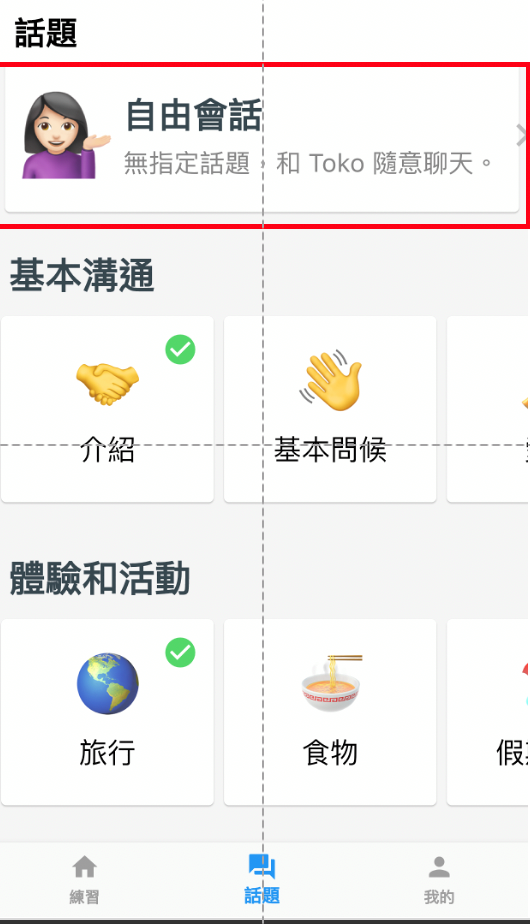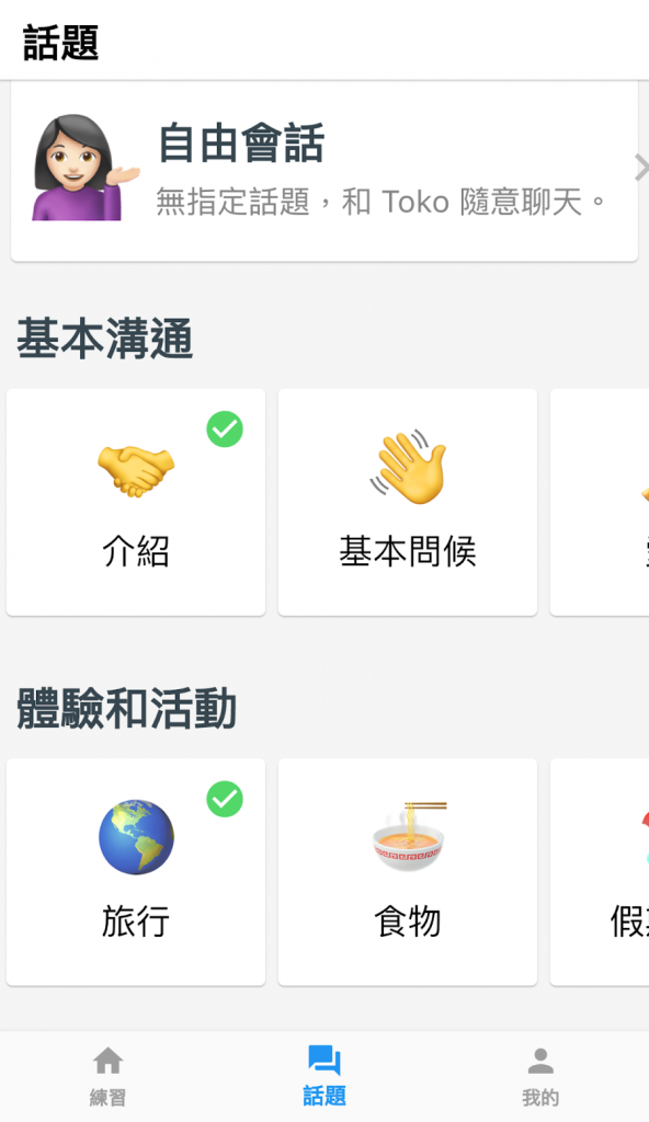 Toko 最大的優勢,就是練習的過程你都是「對著 AI」講,完全不需要擔心看到真人皺眉、困惑的表情,而且在 App 首頁裡,Toko 已經準備好數十種話題,涵蓋生活、興趣、職業、時事等各個面向,完全不需要擔心當天到底該跟 AI 聊什麼話題才好。