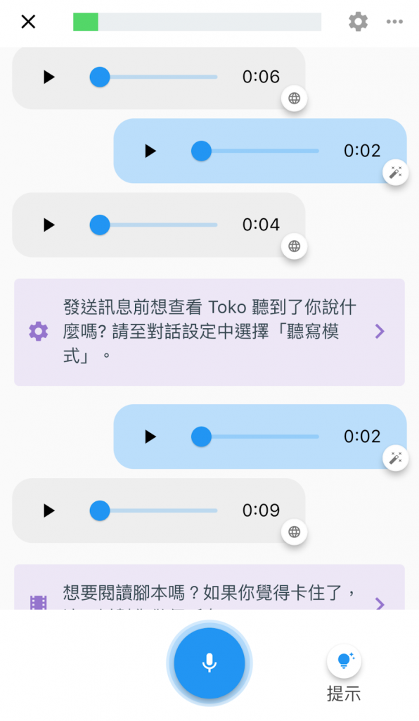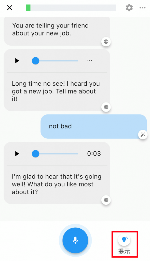當然,如果練習到一半覺得太刺激、聊不下去了,你隨時可以取消「打電話」這個模式,改回一般的錄音對話,這樣你就又能即時看到語句改善建議,也能從「提示」中得到回應建議。