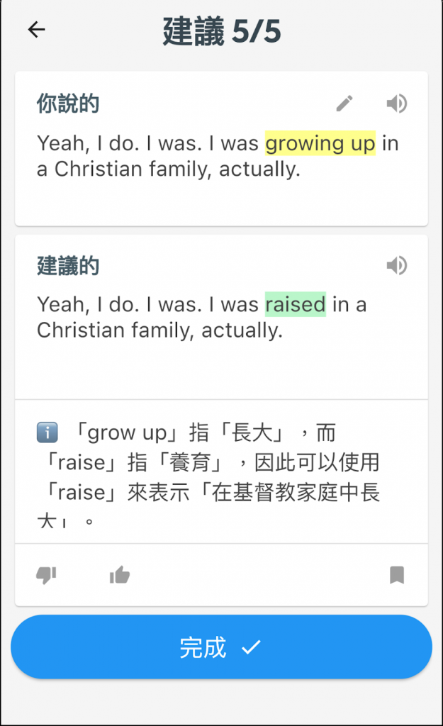 練習結束後,AI 會自動針對剛才的對話,給予你 5 個改善建議。這些建議你都可以收藏,方便未來複習。建議的內容除了文法,還會分享一些用詞建議,幫助你未來能講出更道地、更口語化的英語。