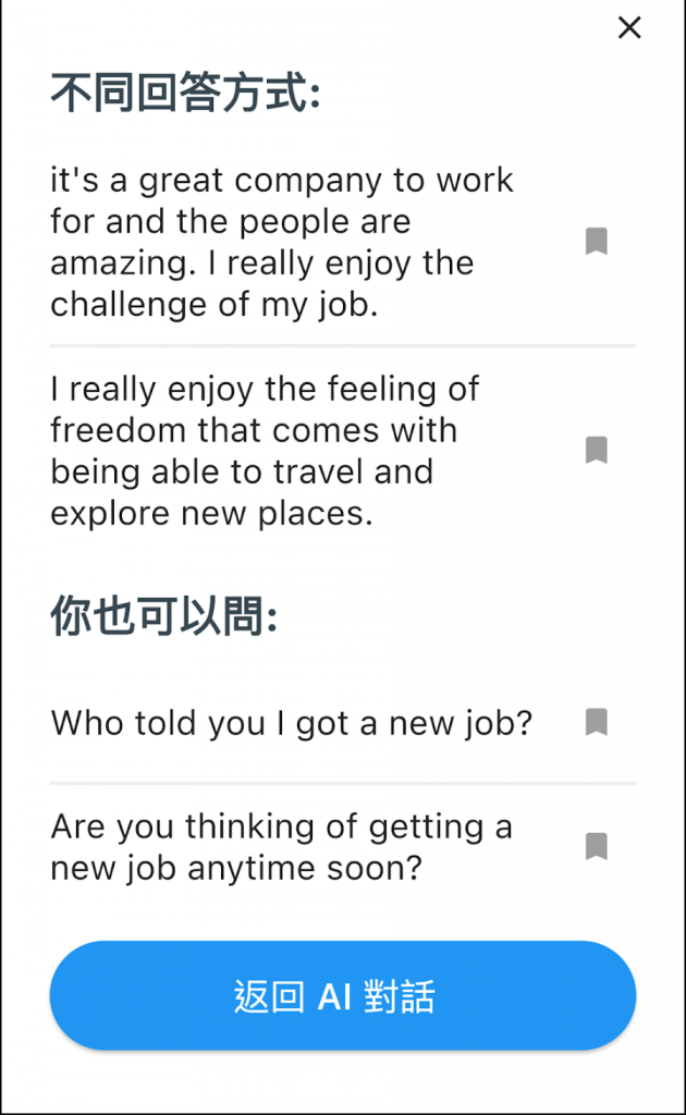 Tips:雖然我自己練習的時候,很常需要用到「提示」,但我很少會照著系統建議的句子唸。我比較推薦你看懂內容後就將畫面關掉,練習用自己的話表達。因為通常接不上話的時候,我們其實只需要一個「回應主題」,看完後用自己的話回應,更接近現實中的聊天。如果你害怕回覆太慢、讓對話涼掉,請記得:「放心,AI 會等你」。