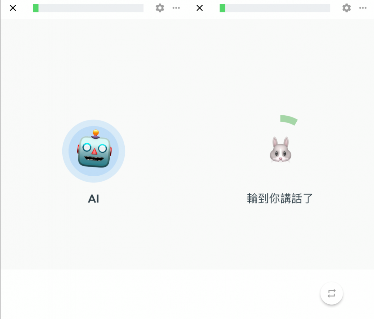 開啟這個功能後,再回到「真實 AI 對話」這個情境裡,你會發現畫面已經完全淨空,即時顯示聊天紀錄、文法建議、提示按鈕全部不見了,畫面上只會輪流出現一個機器人和兔子 emoji,分別代表 AI 和你,整個對話過程,完全就像你正在透過電話,跟國外的一位朋友聊天一樣。