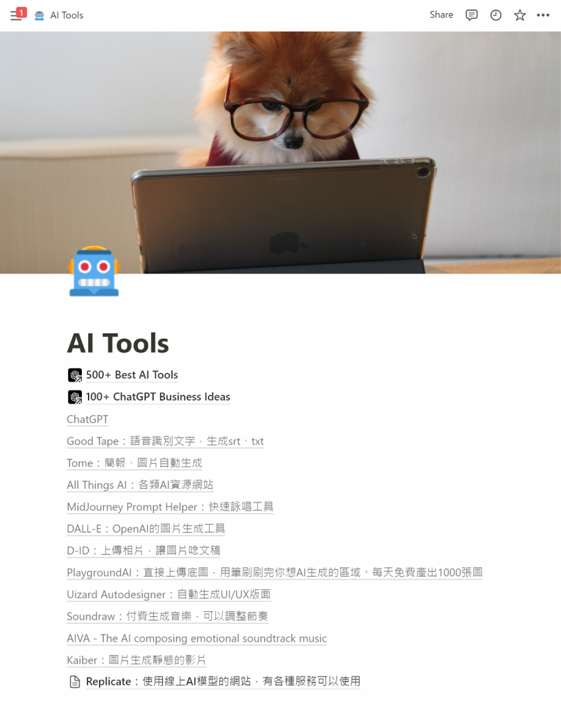 例如這是我自己整理的 Notion 筆記。我會將發現的網站名稱加上簡單一句使用方式,附上超連結放在筆記分頁中,讓我自己可以一目瞭然重新想起這個工具的用途,直接對應我需要解決的問題。如果沒有在使用筆記軟體,建立一個瀏覽器書籤資料夾,給書籤取名,也是個方便的應用方式。