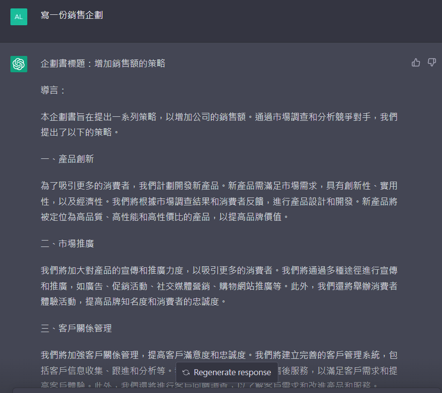 另一種反應,就是我將「寫一篇銷售企劃」這個指令再輸入一次,頂多加上「寫一篇明確的銷售企劃」,但 ChatGPT 並不一定能了解「明確」的定義到底是什麼,因此最後它仍然會給我相似的回答。