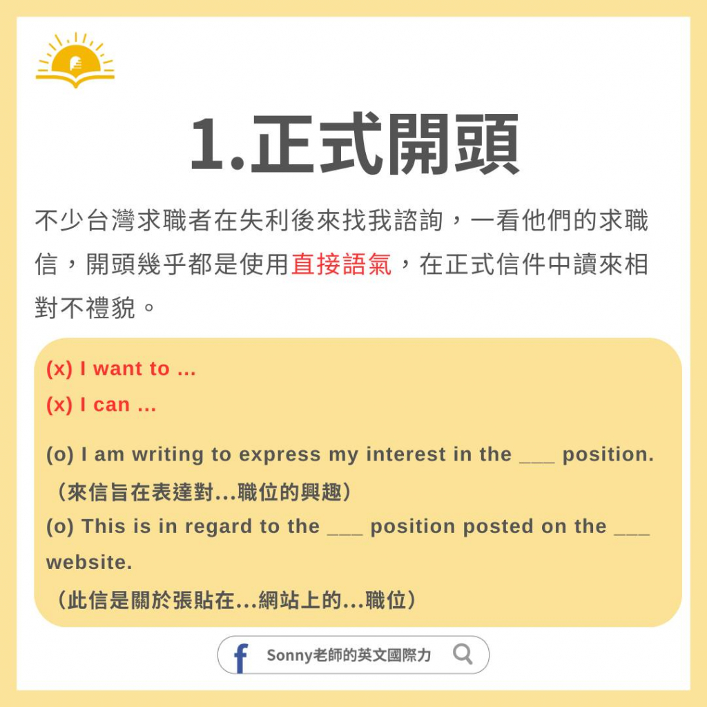 不少台灣求職者在失利後來找我諮詢,一看他們的求職信,開頭幾乎都是:I want to… / I can…。這兩種用法都是「直接語氣」,在正式信件中讀來相對不禮貌