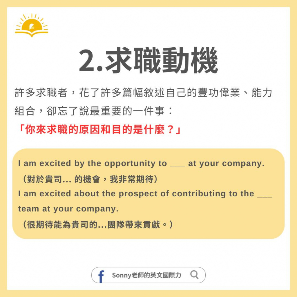 我也發現許多求職者,花了許多篇幅敘述自己的豐功偉業、能力組合,卻忘了說最重要的一件事:「你來求職的原因和目的是什麼?」沒有說明這點,人資或主管也很難放心地發面試通知給你,因為不知道你到底是不是認真的。我們可以用以下句型來表達自己的求職動機:
