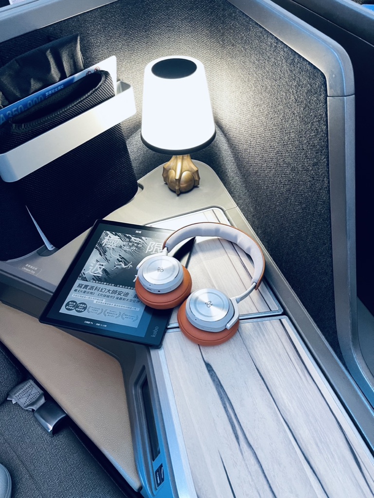 某趟航程中讀著科幻小說《極限返航》。(圖 / 李君婷提供)