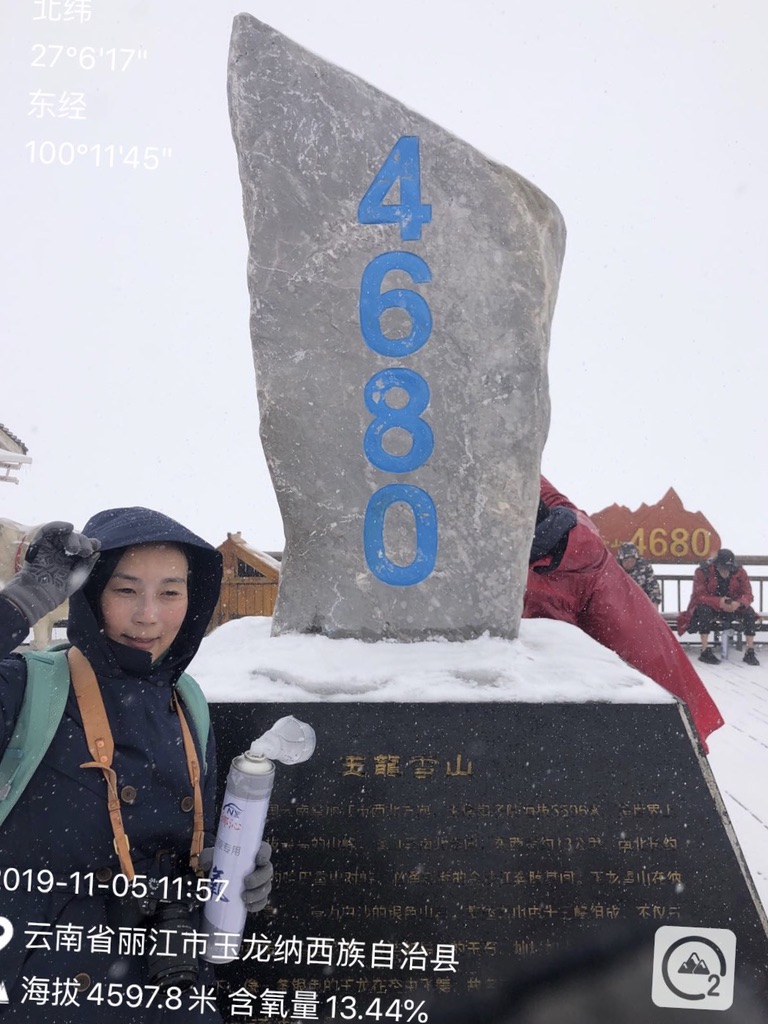 以缺氧狀態造訪雲南玉龍雪山頂,君婷老師笑稱手上的是救急卻不怎麼有用的氧氣瓶。(圖 / 李君婷提供)