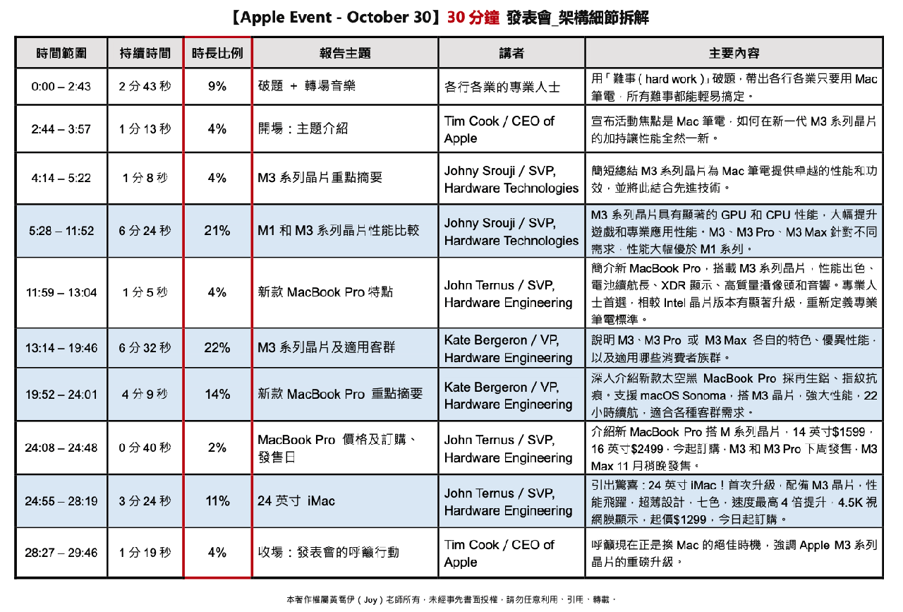 在這個資訊氾濫且人們注意力分散的年代,要抓住大家的眼球,一定要做好精心規劃,確保內容流暢,且各項要點間都有連貫性,同時適切分配每個主題的時間。從蘋果這場30分鐘的發表會中,我們可以看到每一主題在整體中所佔的時間比例(如紅框所示),那些給予較多時間的部分(如藍底所示)往往是聽眾最關心的內容。事前的用心規劃,才能在報告當下真正抓住聽眾的心,展現影響力。