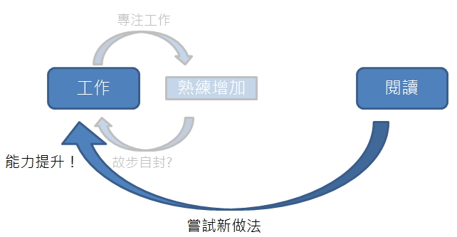 而閱讀後,若能把吸收的理論知識拿回工作中加以實證,則又可以進一步強化新思維,增加理論轉為實際可行的方法。(如下圖)