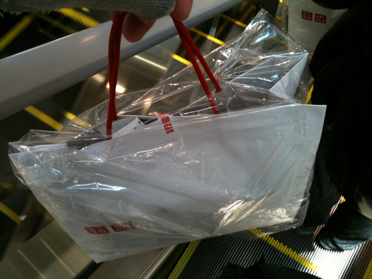 大阪的心齋橋是個知名的商圈,我們一行人到了那裡剛好遇上UNIQLO週年慶,也遇上了一場大雨!結帳區的店員便替每位客戶的購物袋上,加套了透明塑膠袋來防水。結果當我走出服裝店,發現街上每位遊客的提袋都有類似的塑膠套,看來這已經是所有店家的標準服務了!