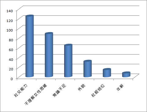以上圖為例,「社交能力」這歸因造成的問題超過一百二十次;以比例而言,佔所有問題的37.4%。 這代表「社交能力」不足恐怕是你現階段需要最積極改善之處。 換句話而言,若社交問題能獲得明顯改善,你目前所面臨的異性互動問題很可能可以降為原來的62.6%;也就是十次的互動中,你可以減少3.7次不愉快出現的機率。