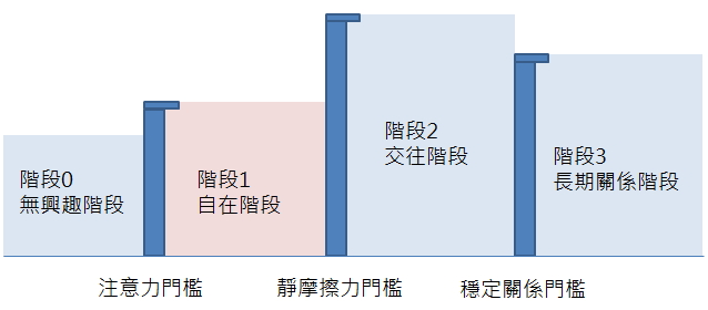 除了真正決定是否交往的「靜摩擦力門檻」外,要女人把你當一回事,前面其實還有另一個非常重要的區域,我把它稱為「自在階段」。